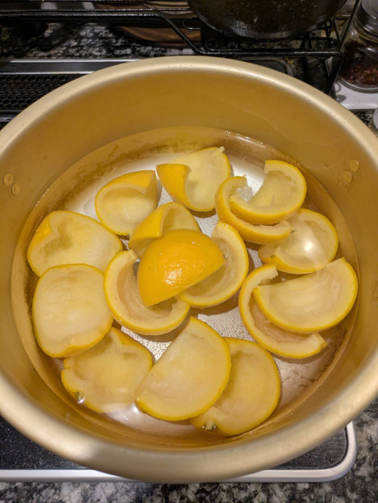 鍋に皮とたっぷりの水を入れ、沸騰してから10分ほど煮ます。お湯を捨てて、新しい水でまた煮る…これを2回繰り返してください。