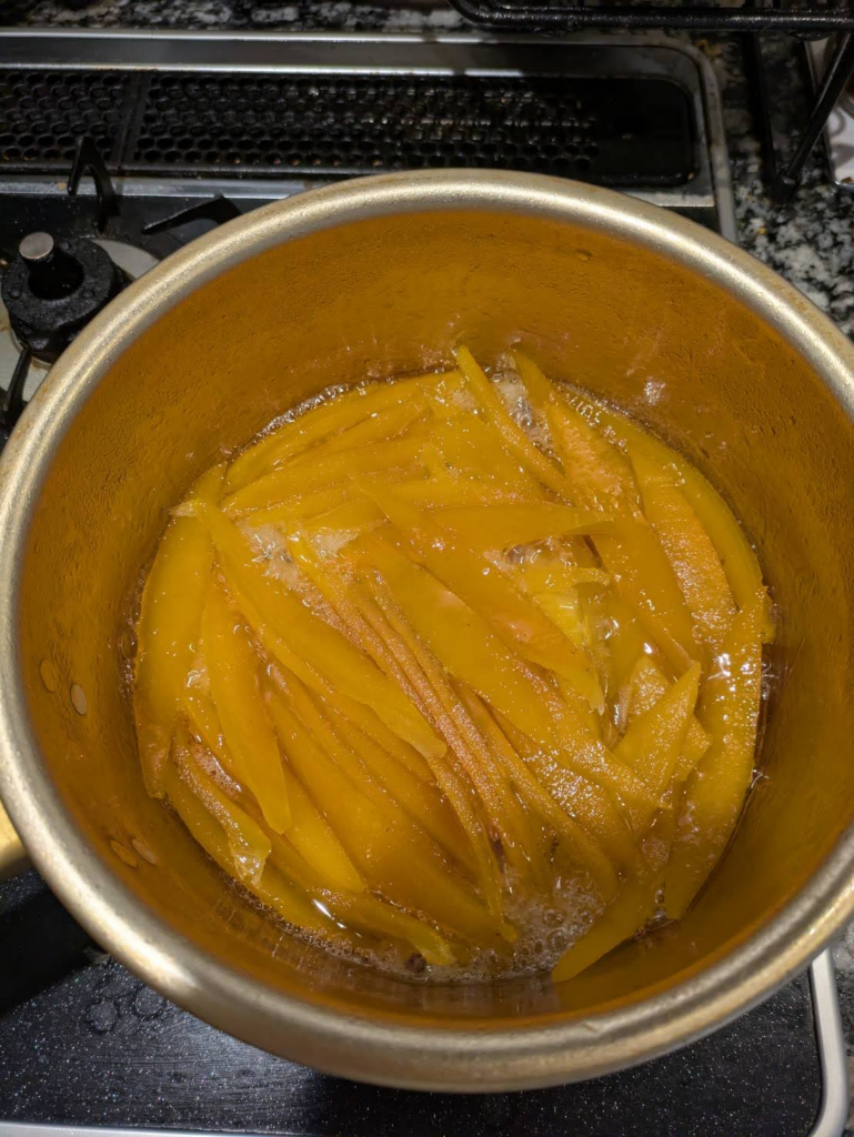 お鍋に皮、水、砂糖、(あればブランデー)を入れて火にかけます。最初は中火で、ふつふつしてきたら弱火に。