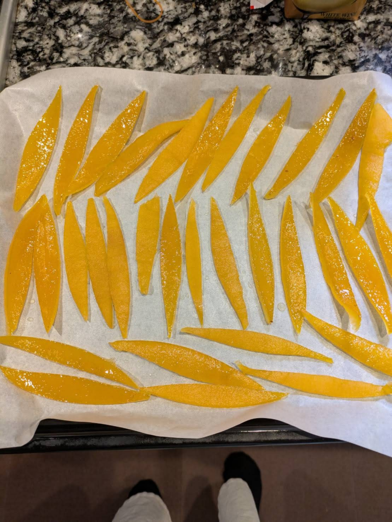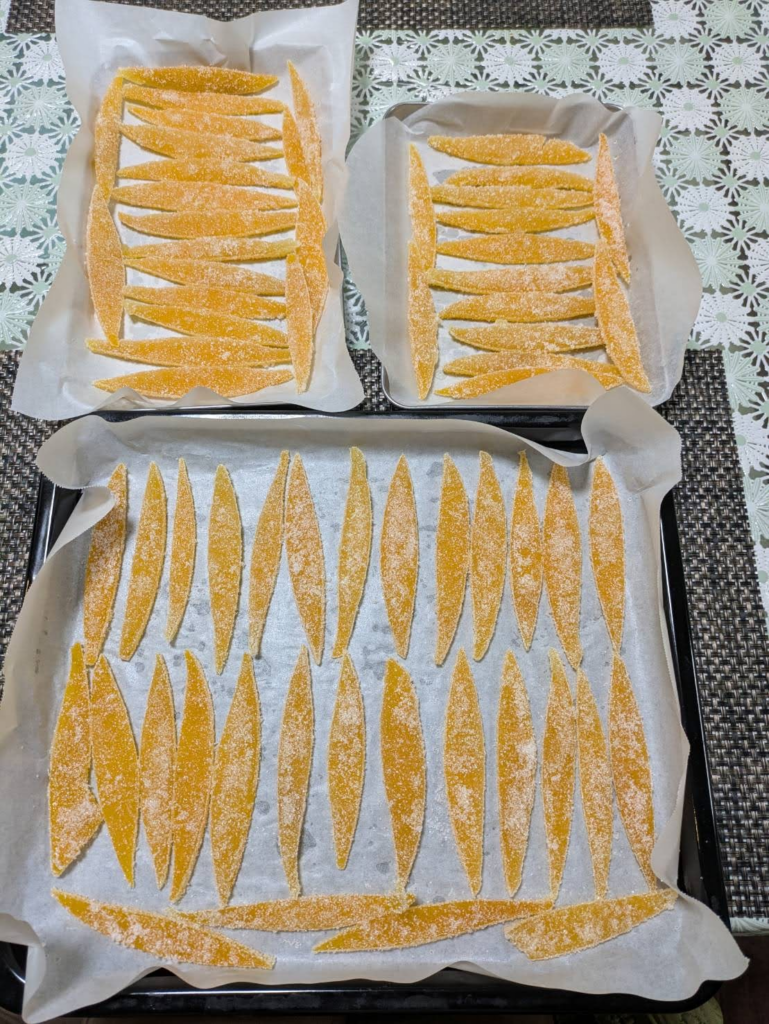 水分が飛んで、艶やかなオレンジ色になったら、クッキングシートの上に並べて乾かします。