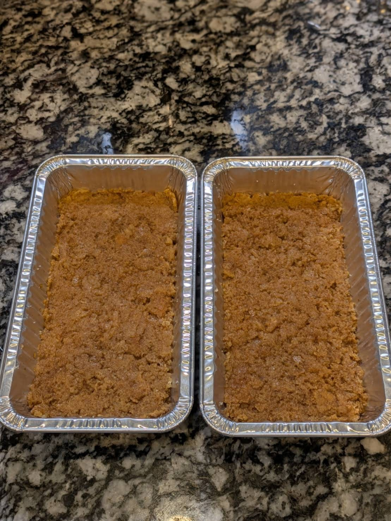 - ドーナツを準備!ドーナツを横に倒して、厚みを半分に切ります。だいたいの大きさで大丈夫ですよ。これを角皿の底に隙間なく敷き詰めます。パズルみたいでお子様も喜ぶ工程です!