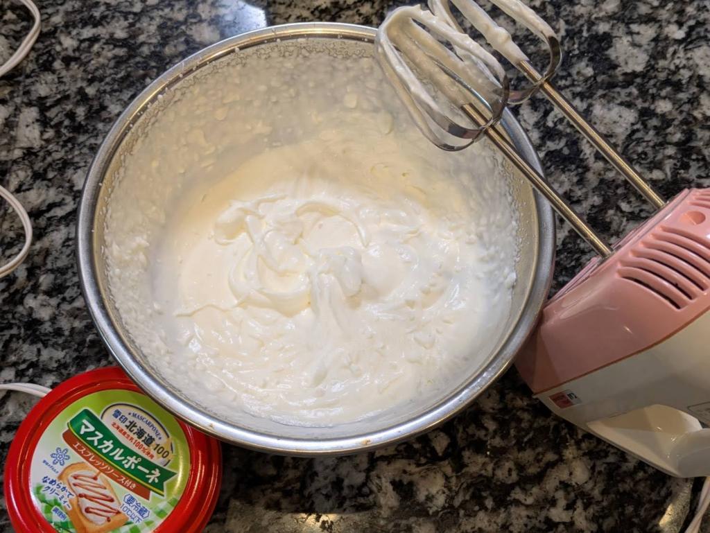 使う直前まで冷蔵庫でキンキンに冷やしておくと、泡立ちが早くなり、マスカルポーネと混ぜた時も分離しにくくなりますよ。