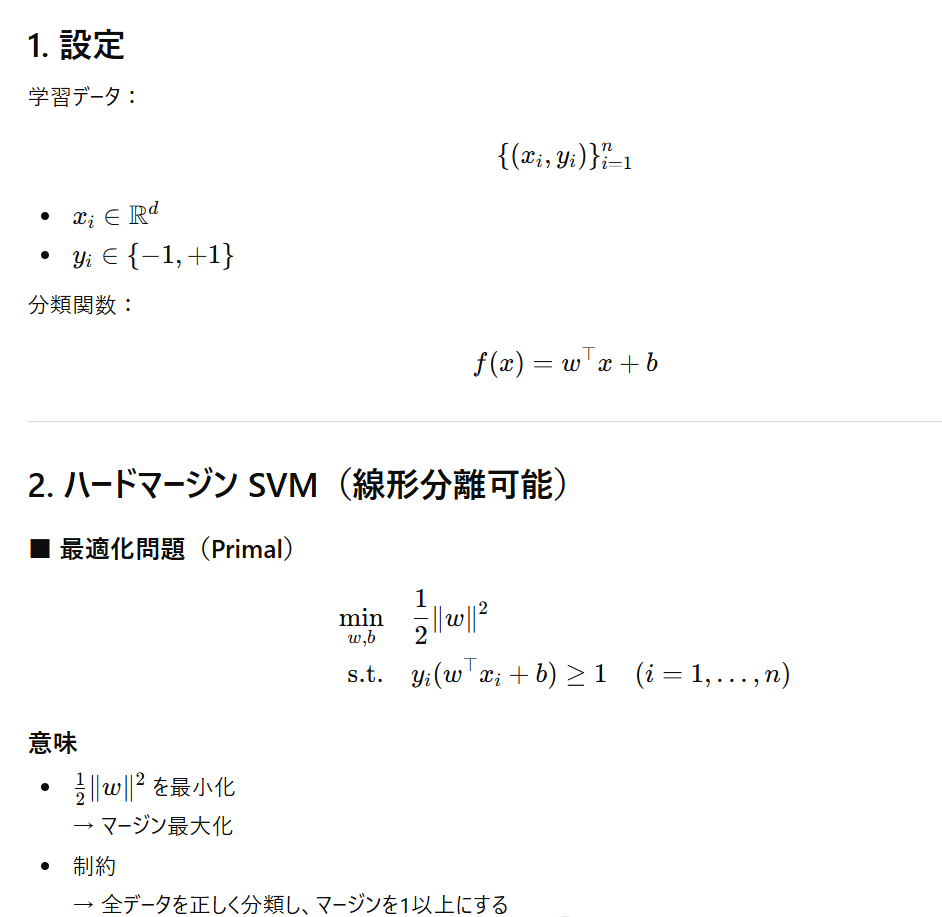- 決定境界を可視化してみる2次元のデータを使ってSVMを学習させ、その決定境界とサポートベクターをグラフにプロットしてみることを強くお勧めします。マージンが最大化されている様子や、サポートベクターが境界を支えている様子を視覚的に理解すると、一気に腑に落ちますよ。