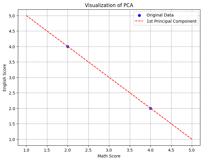 このデータの場合、第1主成分の向きは のような数値になりますが、これは「数学が増えると英語が減る」という、データの散らばり具合の「背骨」を見事に捉えているのです。