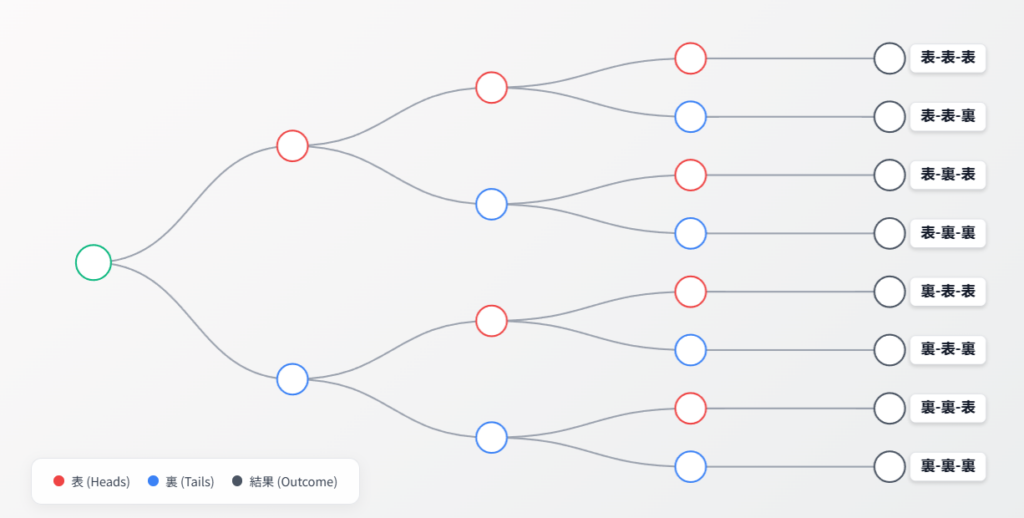 例えば、3 枚のコインを投げて、全てが表になる確率を考えてみましょう。