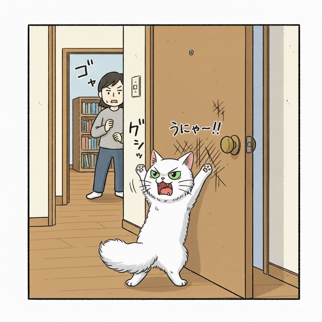 この流れは、ハピちゃんがドアを閉めた瞬間に「開けてーー!」と大騒ぎするのと同じ構造です。