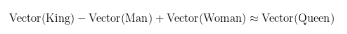 「王様(King)」という座標から、「男(Man)」という要素を引き算し、そこに「女(Woman)」という要素を足すと、なんとその計算結果に一番近い座標に「女王(Queen)」が位置しているのです!