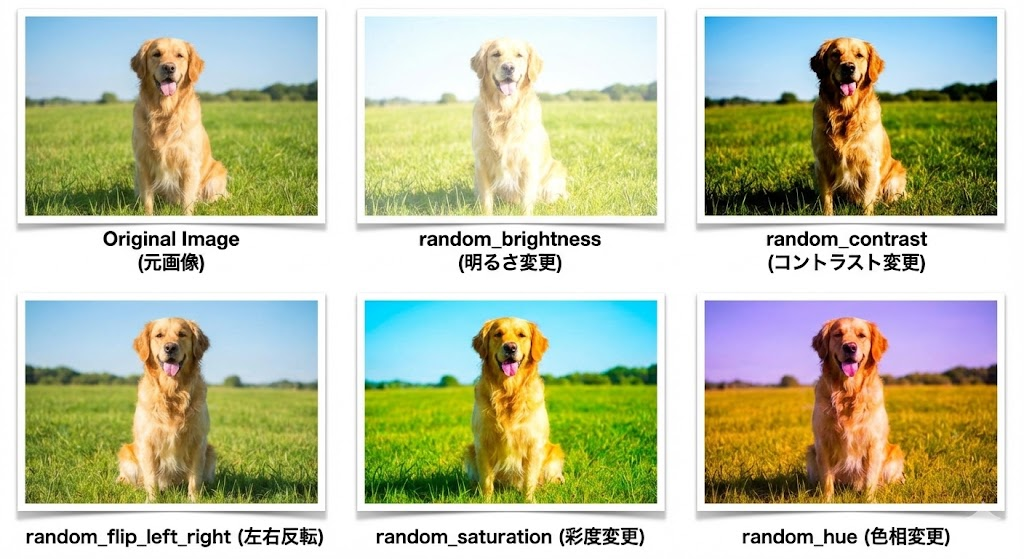 そんなときに強い味方になってくれるのが、TensorFlowに用意されている便利な道具箱、 tf.image.random で始まるメソッドたちです。これらを使えば、手持ちの画像を「自動で」「ランダムに」変化させて、擬似的にデータを増やすことができるんです。これを専門用語で データ拡張(Data Augmentation) と呼びます。
