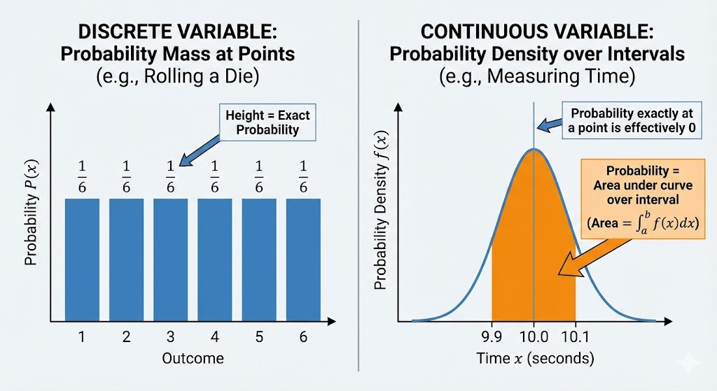 実は、限りなくゼロに近いのです。なぜなら、時間は10.1秒、10.01秒、10.001秒と、どこまでも細かく刻めるからです。連続してつながっている値、これを連続型確率変数と呼びます。