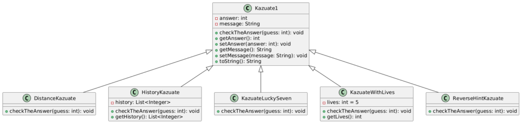 public static Kazuate1 createGame(int guess)Kazuate1 の新規インスタンスを生成し、引数 guesscheckTheAnswer に渡して判定を実行。
