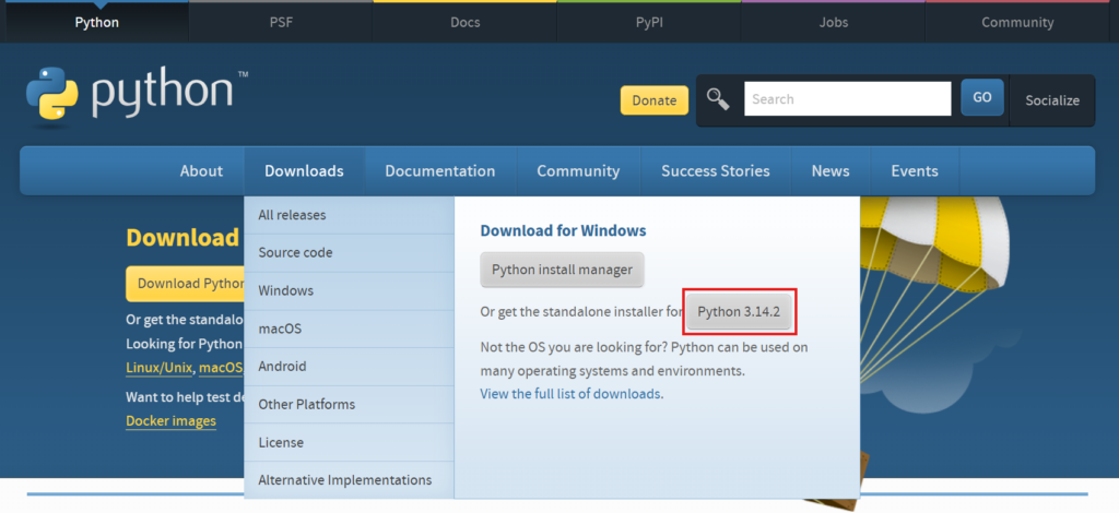 https://www.python.org/を開きます