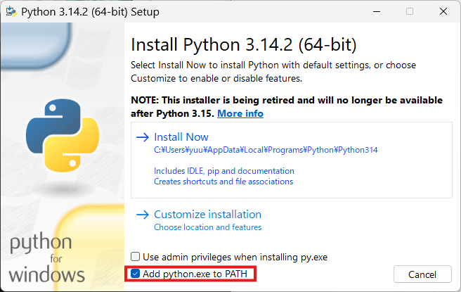 - 重要: 「Add Python to PATH」にチェックを入れます