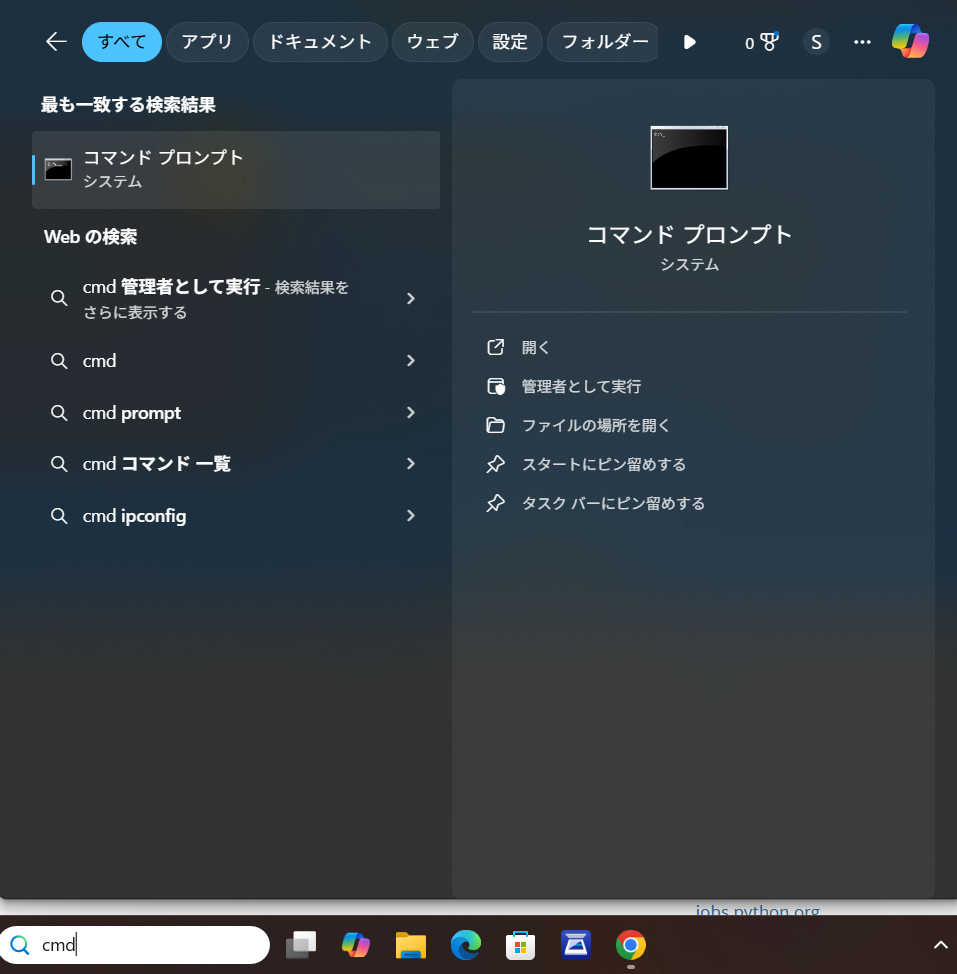 - タスクバーの検索ボックスに「cmd」と入力してコマンドプロンプトを開きます