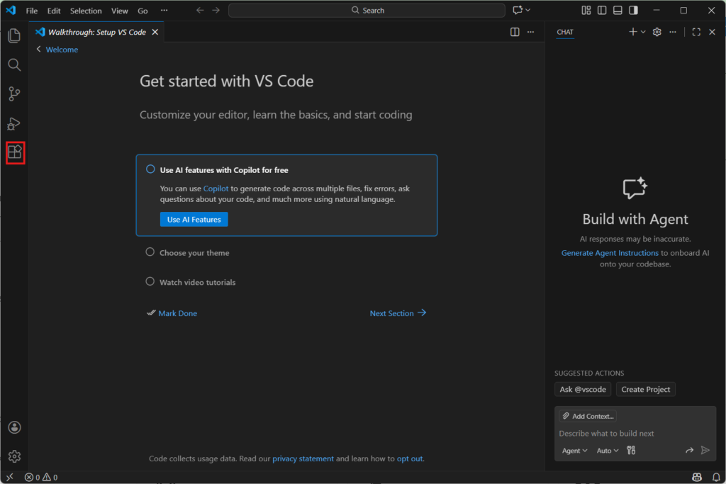 - 左側のサイドバーにある四角いアイコン(Extensions)をクリックします