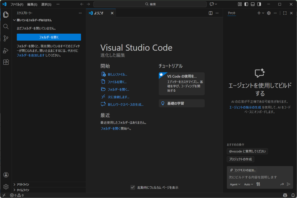 - デスクトップのアイコンまたはスタートメニューからVSCodeを開きます