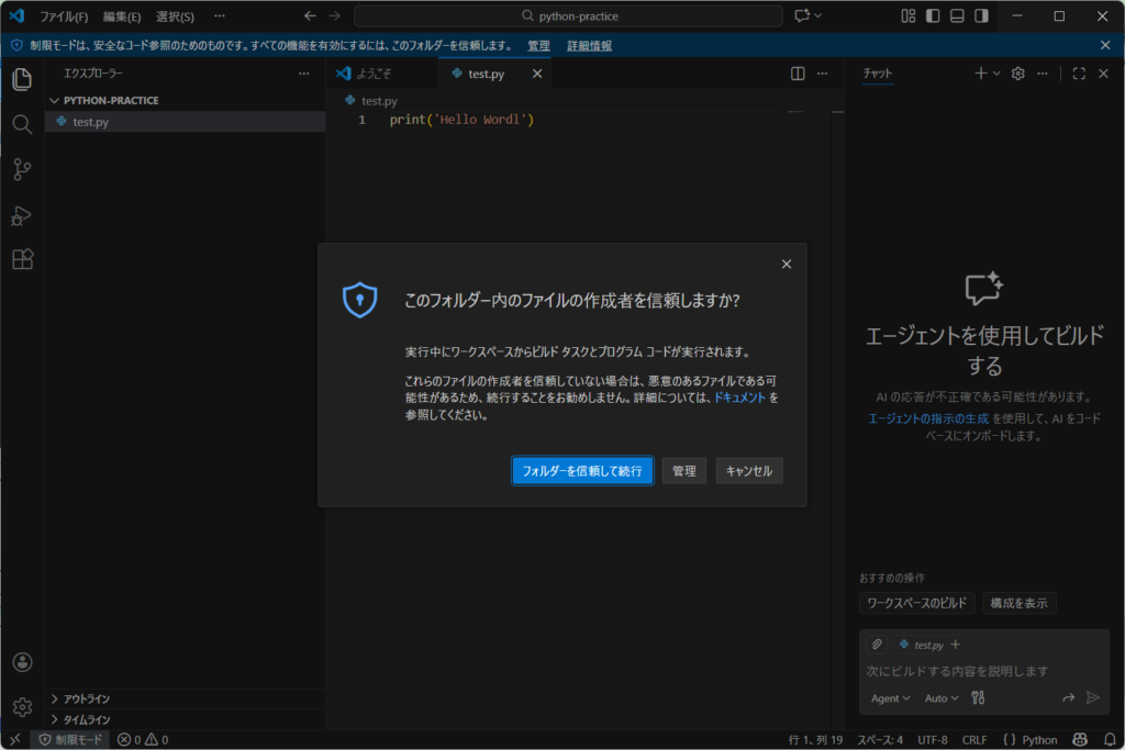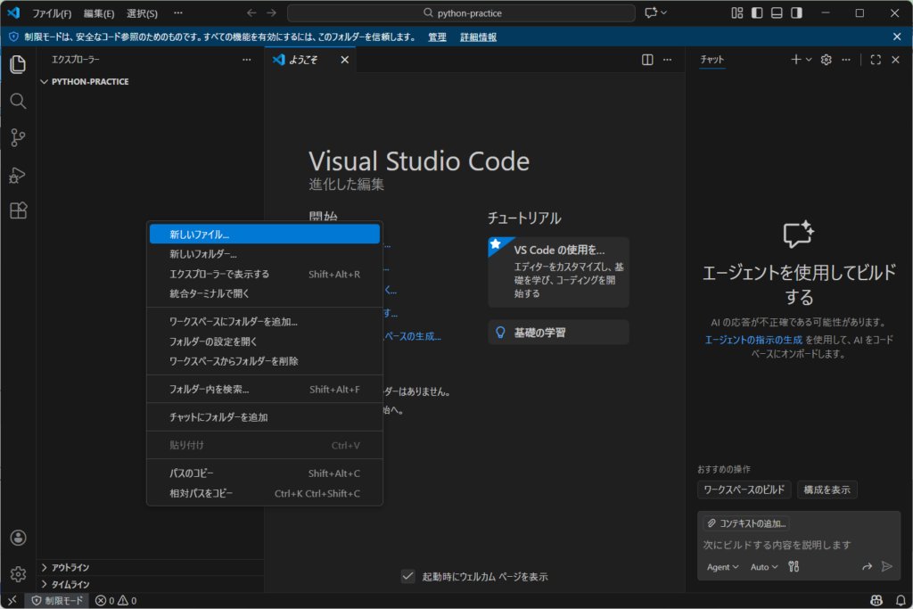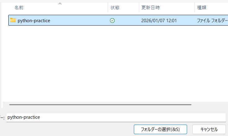 - 作成した「python-practice」フォルダーを選択します