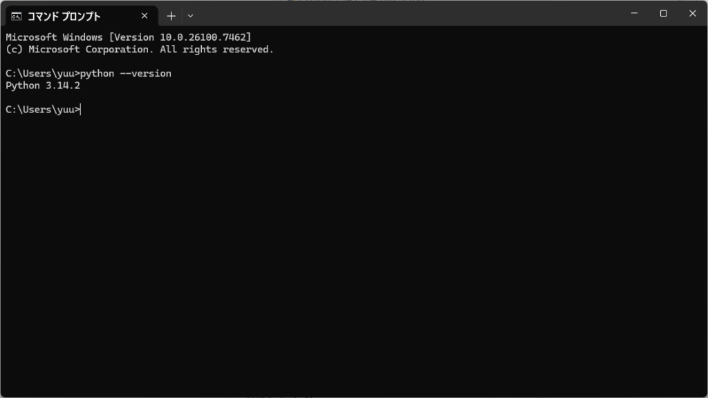 python --versionと入力してEnterキーを押します- 以下のようにバージョンが表示されれば成功です