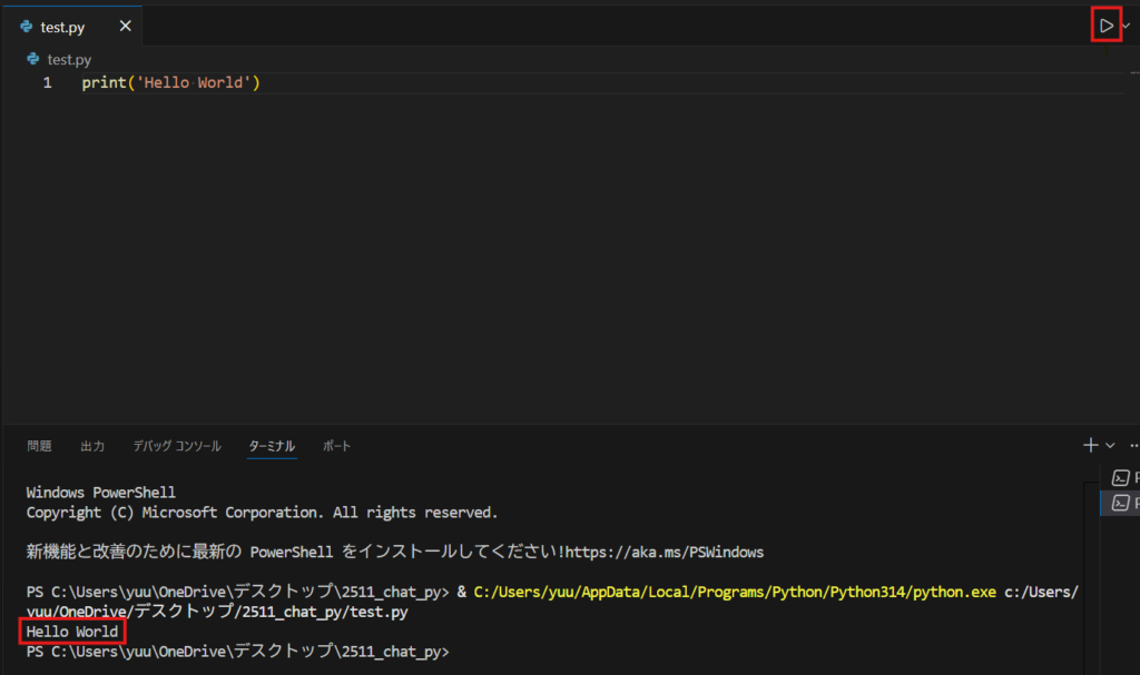 - エディター右上の再生ボタン(▶)をクリック