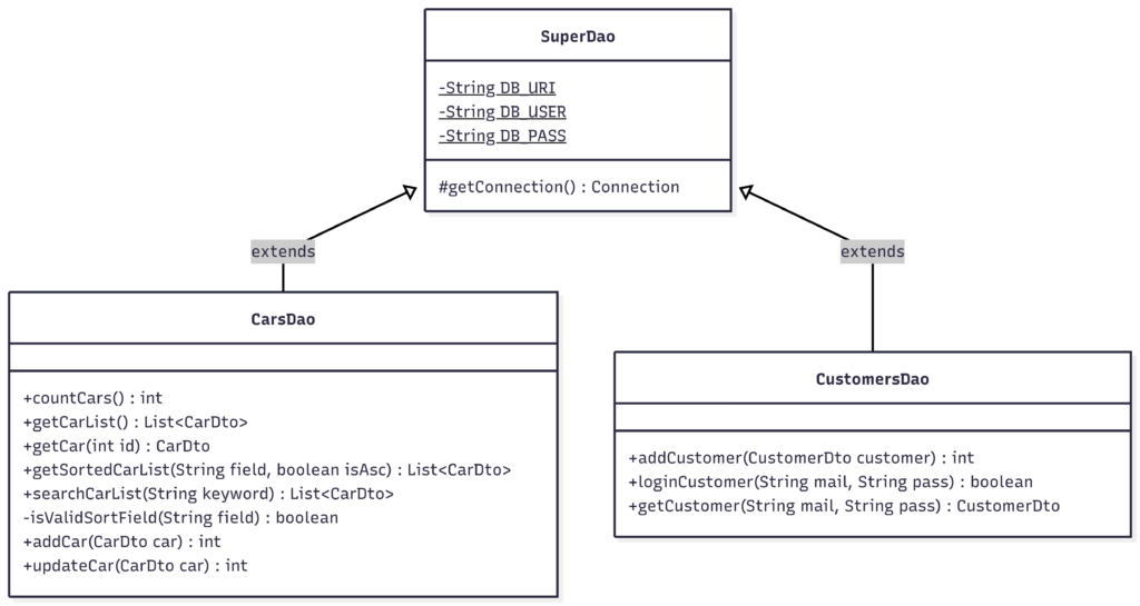 そこで、本書では下図のようにデータベースの接続と切断を行うSuperDaoクラスを作成して、carsやcustomersなどの各テーブルとの操作はSuperDaoクラスのサブクラスとして作成することにします。
